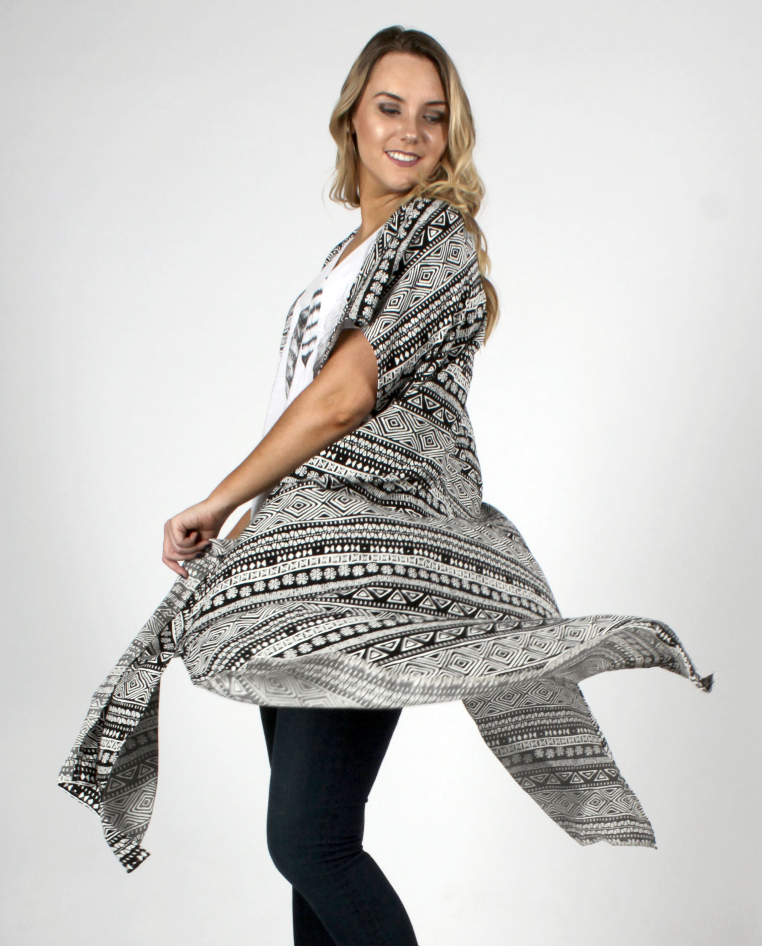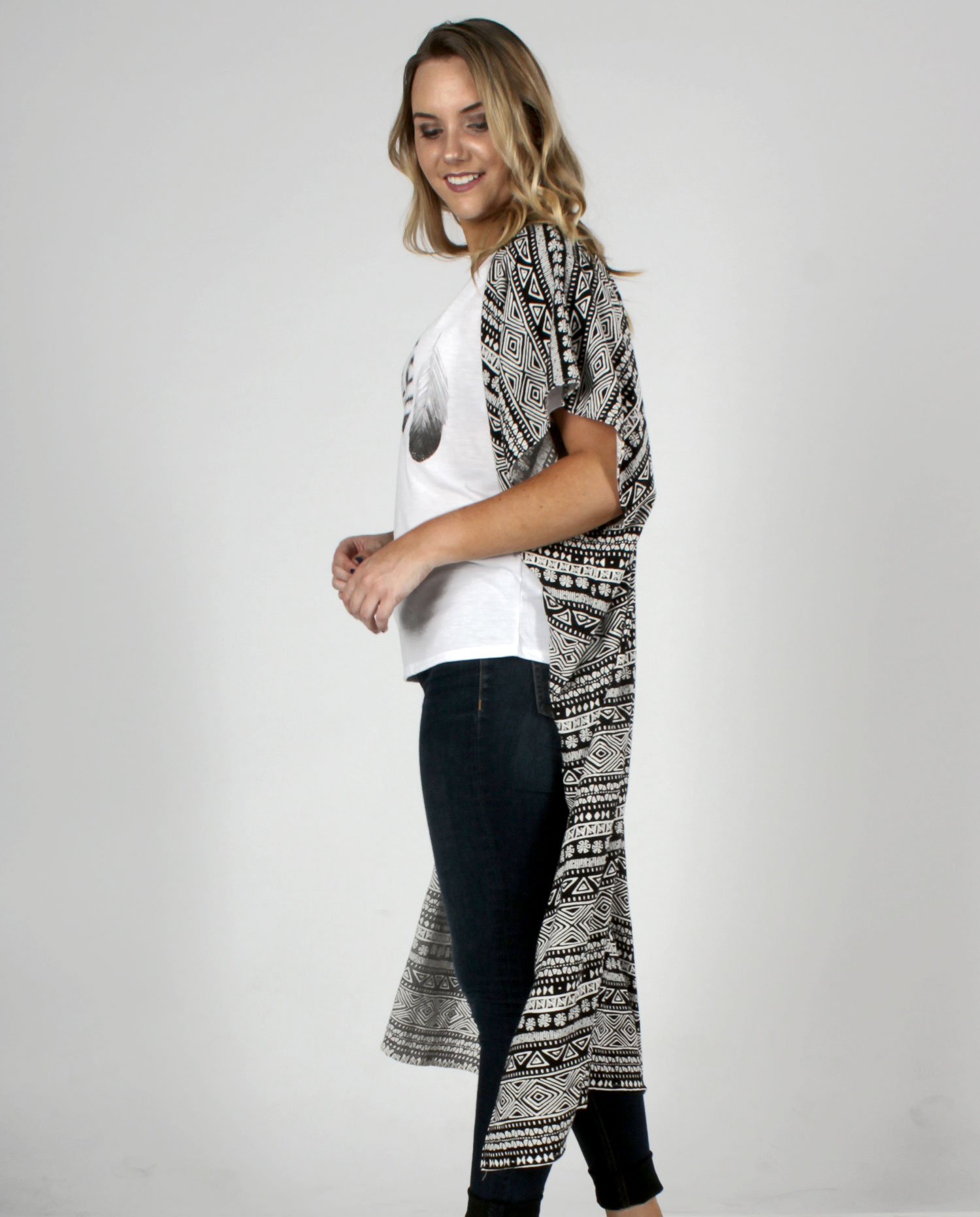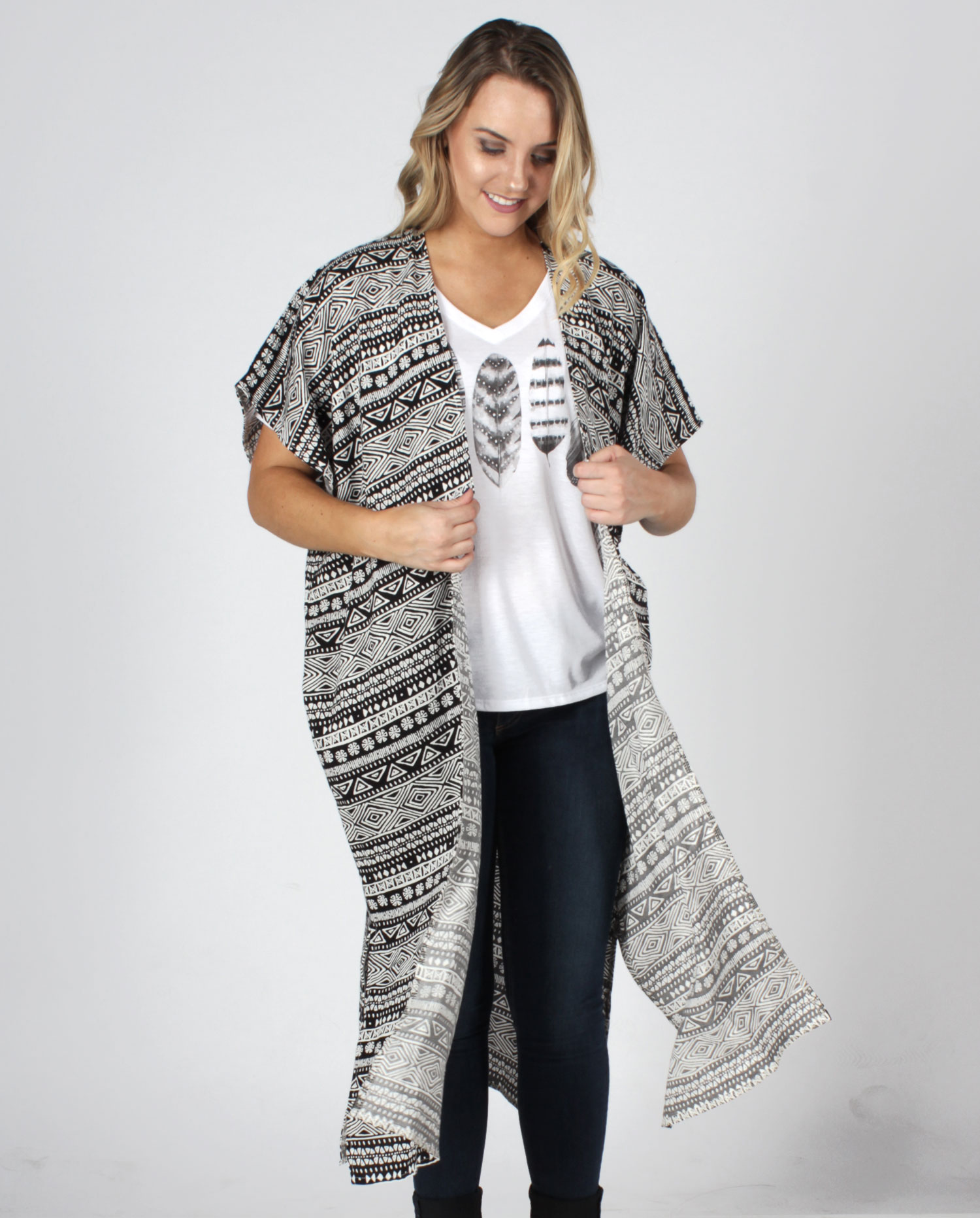 Black and White sleeveless Aztec inspired tribal print duster with side slits. Flowy and effortless.