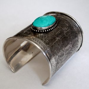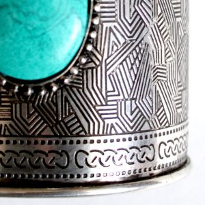 Adorn your wrist with this oversized cuff bracelet with intricate hammered design. Bezel set with synthetic turquoise stone and beaded edge detailing.