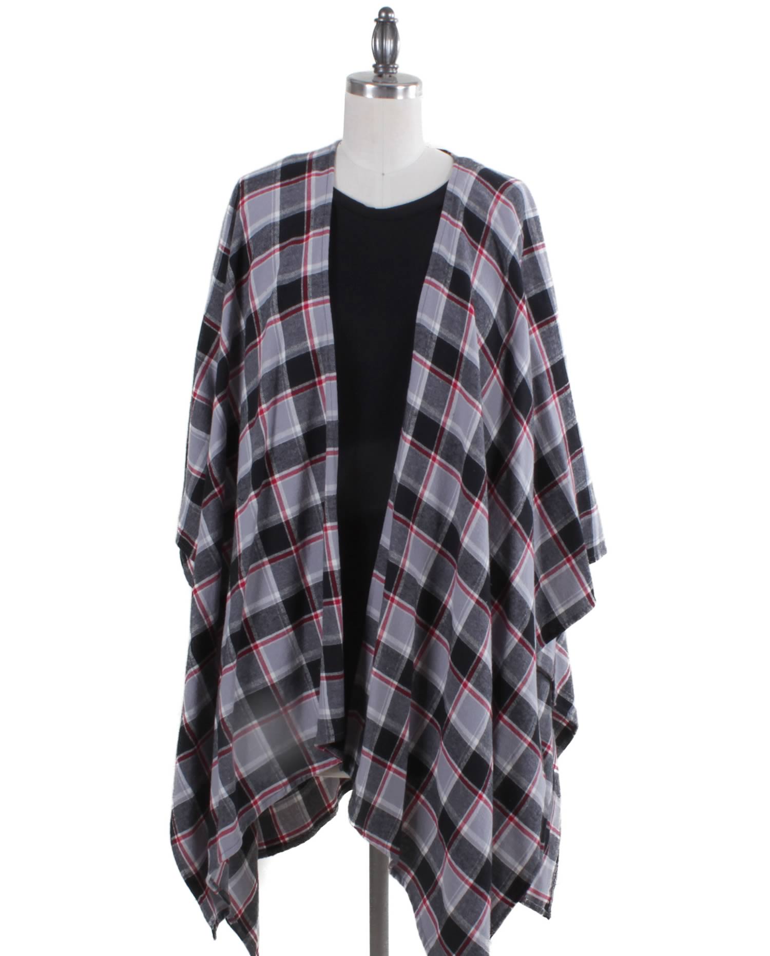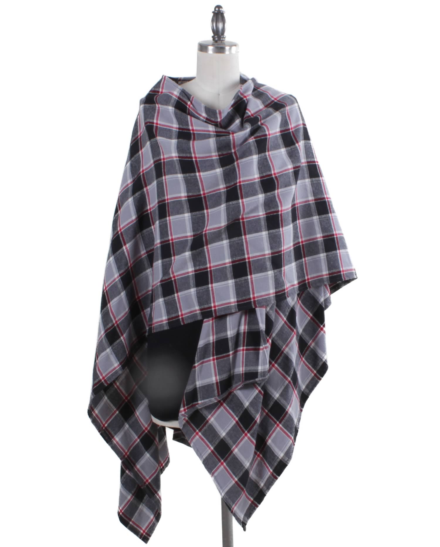 Black, Gray, Red Multi-color Flannel Plaid. This cozy shawl wrap is your go-to piece when you want that warm, comfortable, versatile, effortless yet stylish look.
