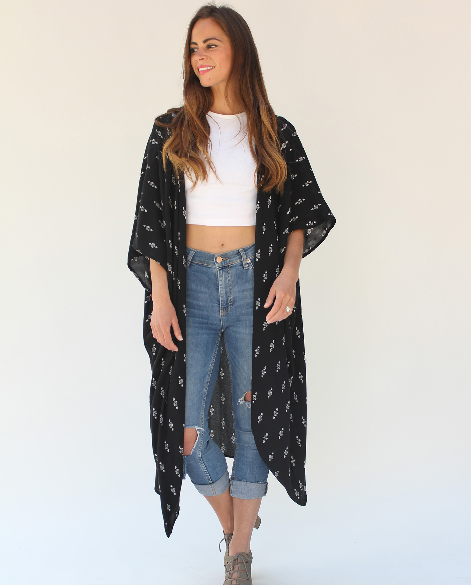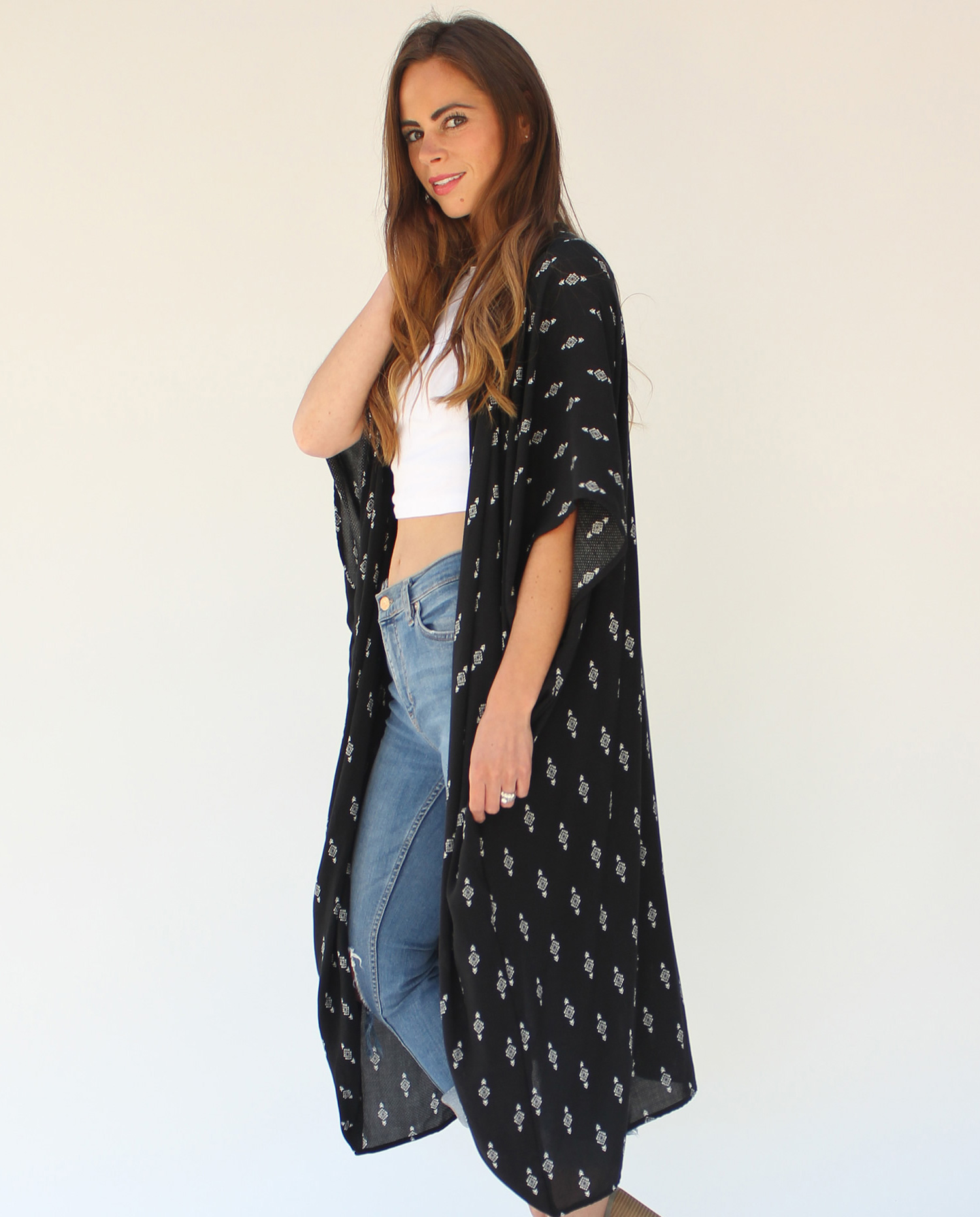 Wear it to music festivals, poolside, the beach, girls night out, date night, run errands. This black duster kimono is perfect for the warmer months.