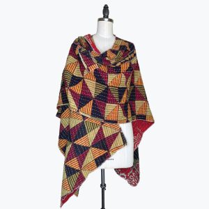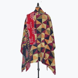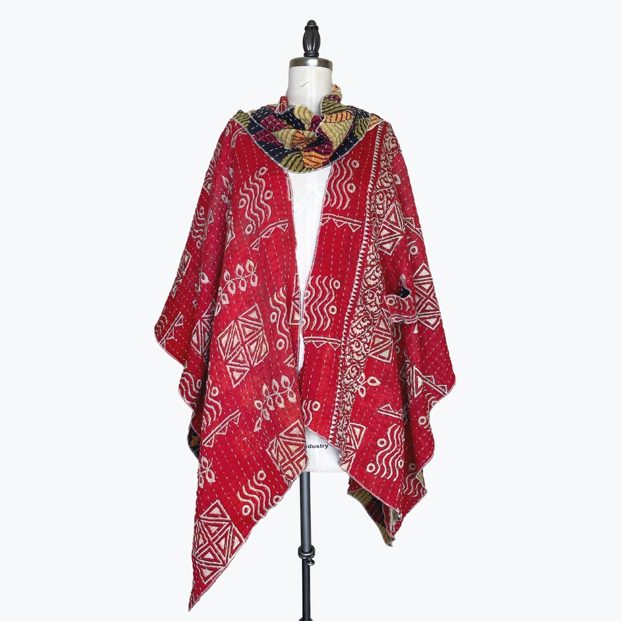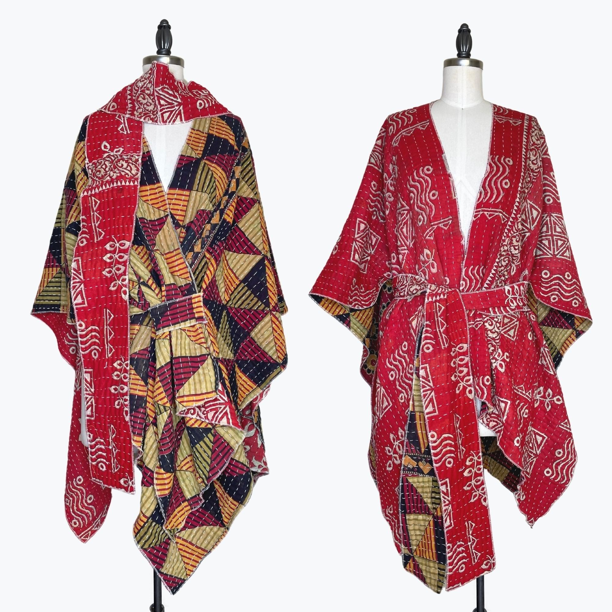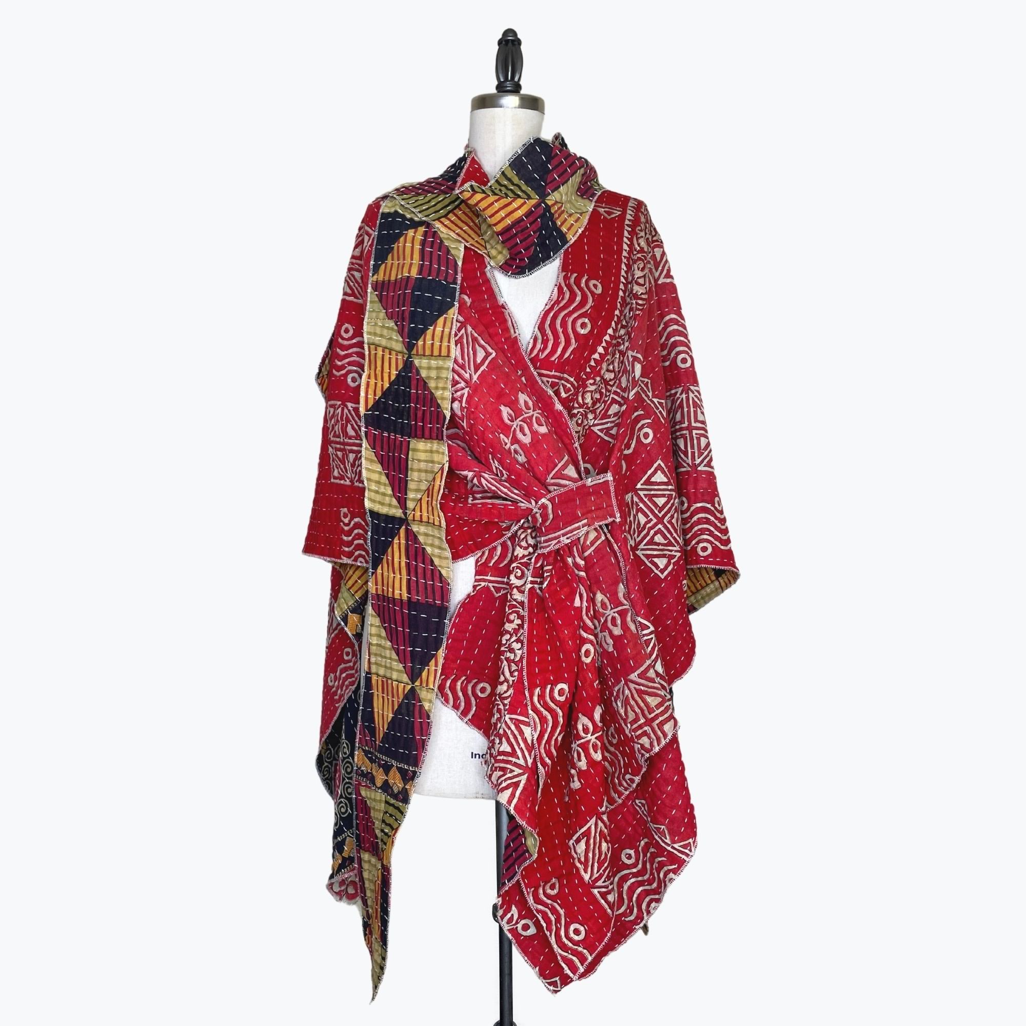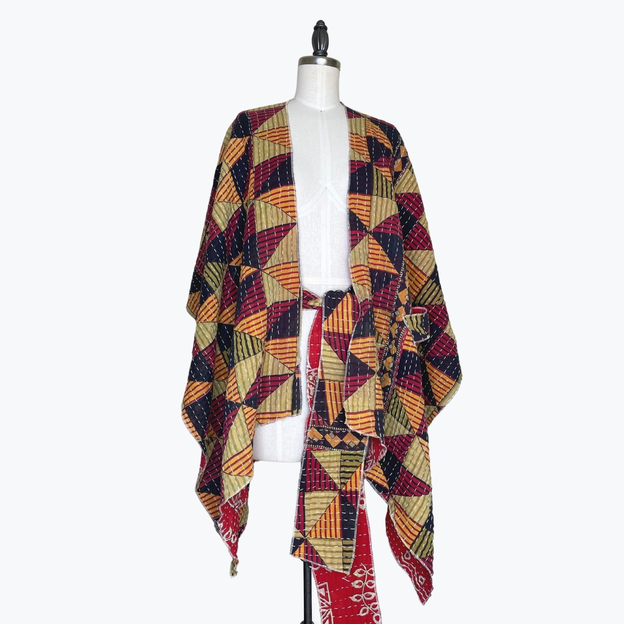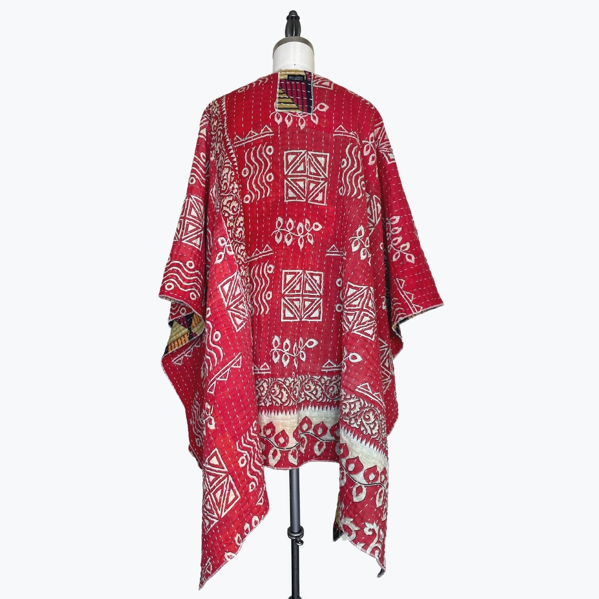 We created this cover-up using an authentic lightweight kantha quilt made from pre-loved vintage 100% cotton sarees, and re-imagined it into a wearable, multi-functional piece. Each one is unique.  More about our Kantha fabric