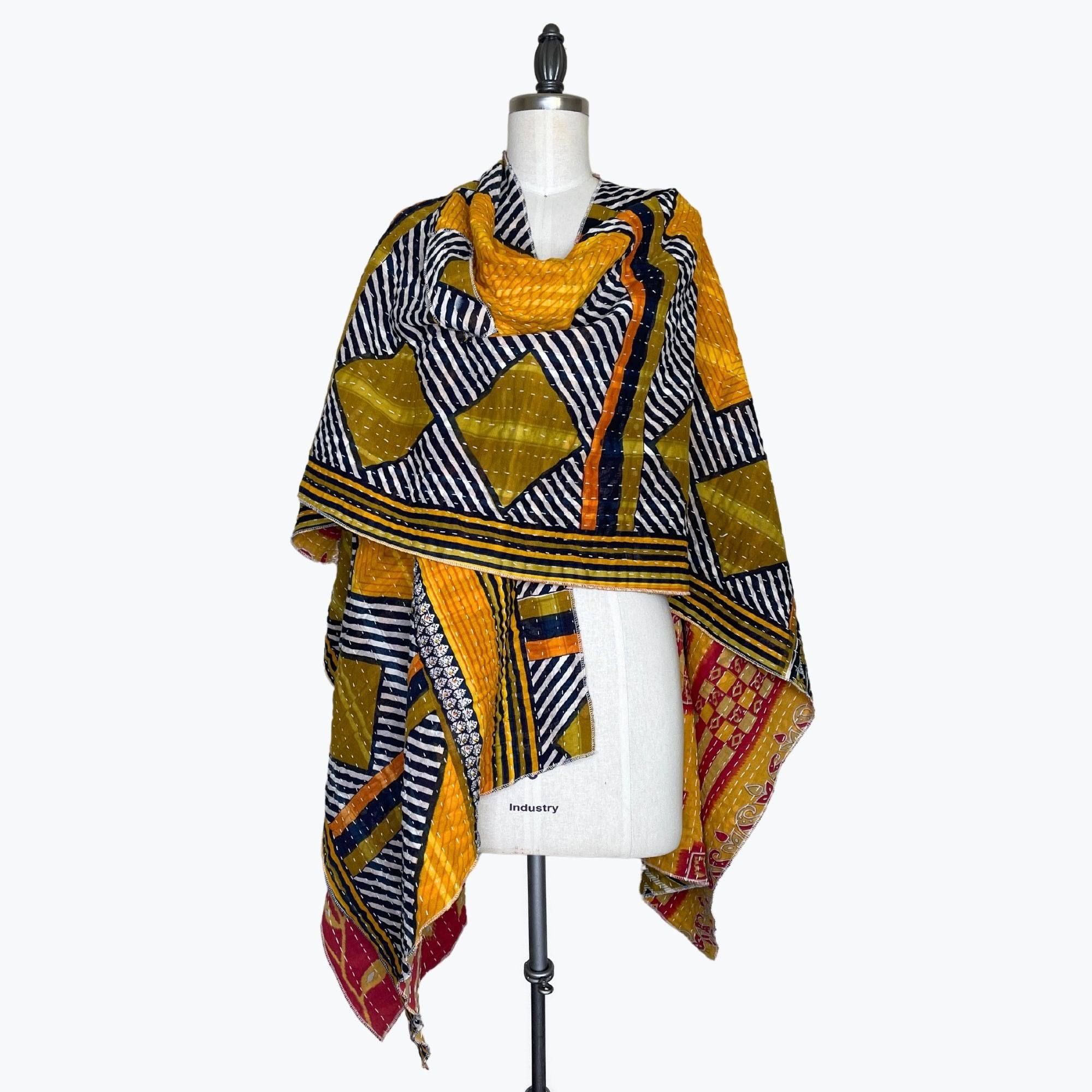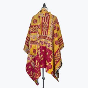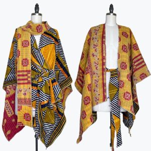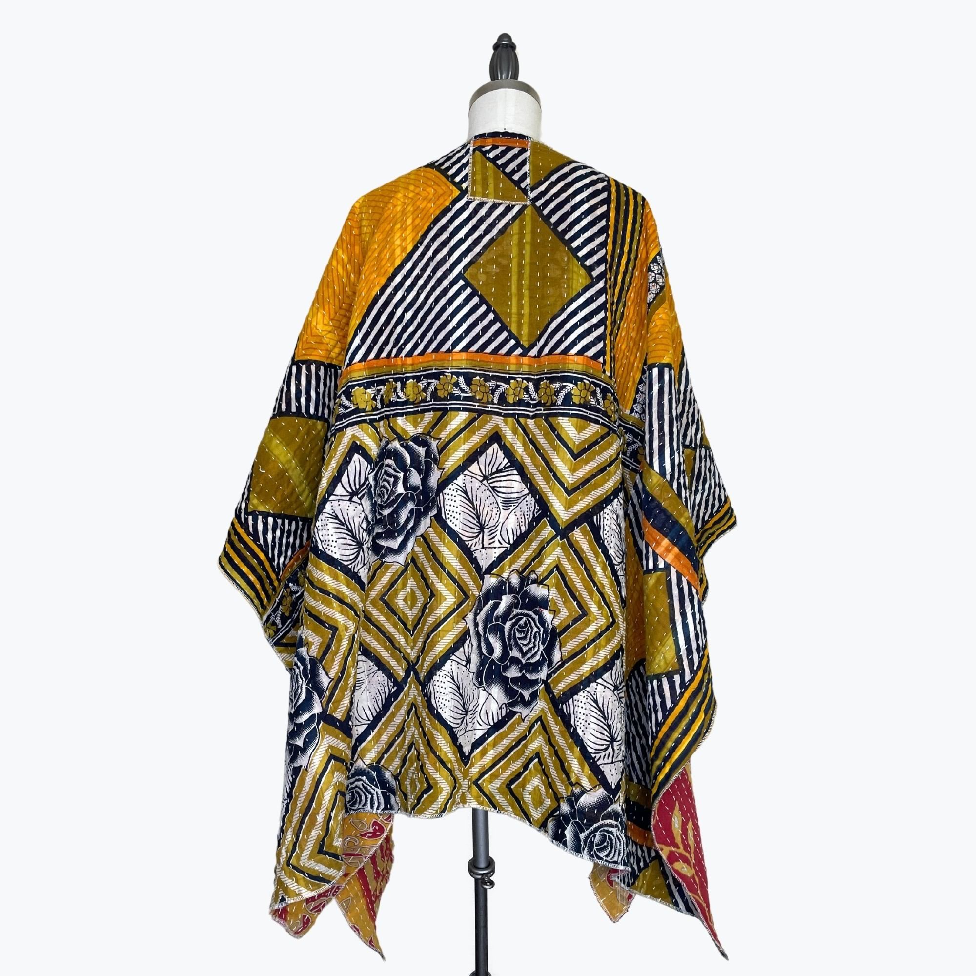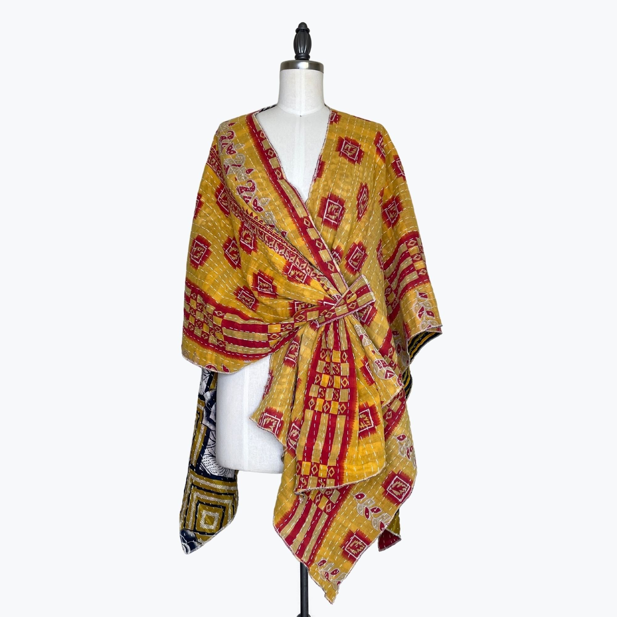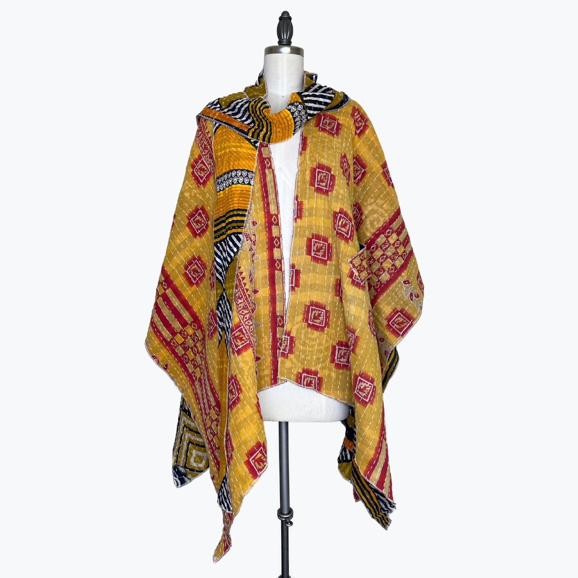 We created this cover-up using an authentic lightweight kantha quilt made from pre-loved vintage 100% cotton sarees, and re-imagined it into a wearable, multi-functional piece. Each one is unique.  More about our Kantha fabric