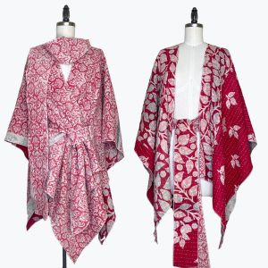We created this cover-up using an authentic lightweight kantha quilt made from pre-loved vintage 100% cotton sarees, and re-imagined it into a wearable, multi-functional piece. Each one is unique.  More about our Kantha fabric