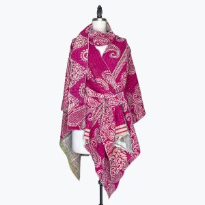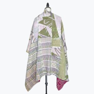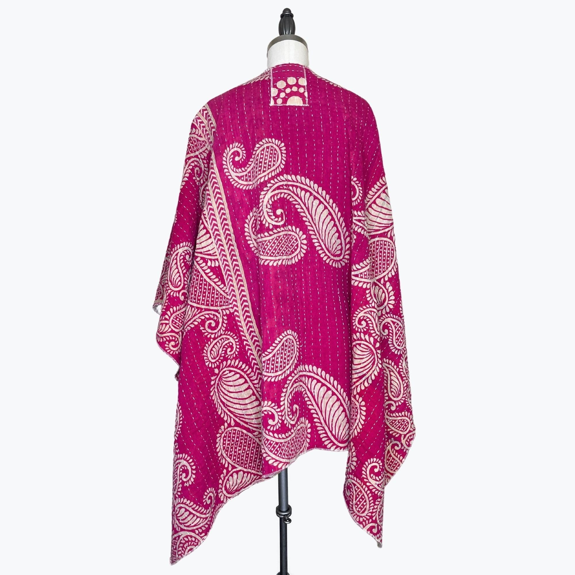 We created this cover-up using an authentic lightweight kantha quilt made from pre-loved vintage 100% cotton sarees, and re-imagined it into a wearable, multi-functional piece. Each one is unique.  More about our Kantha fabric