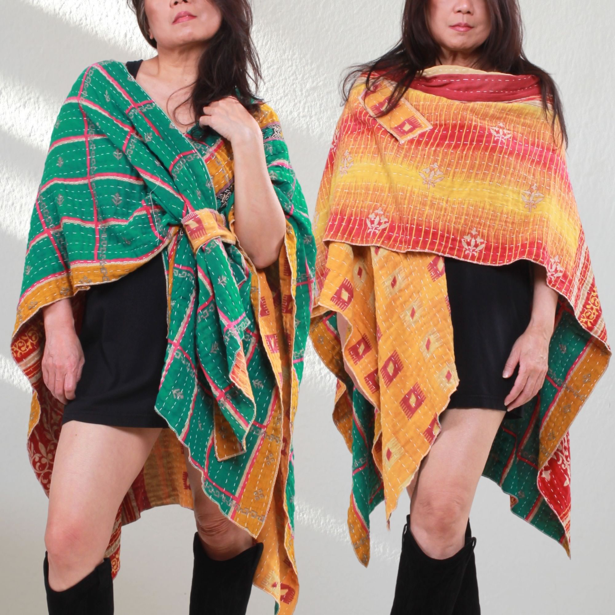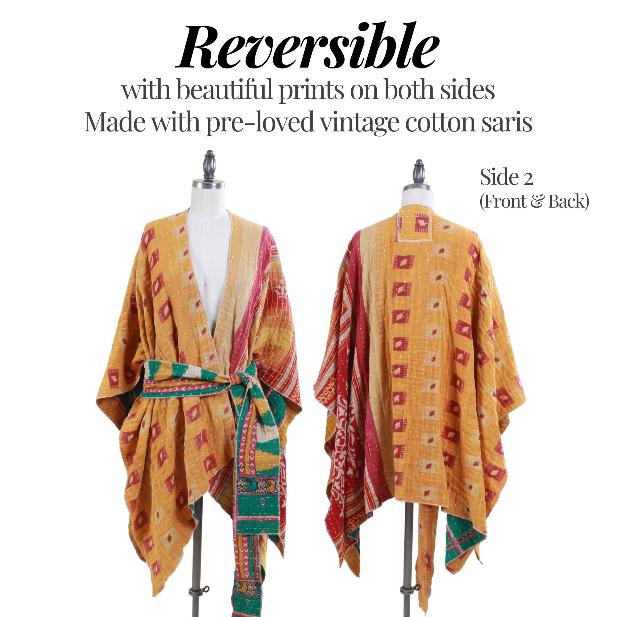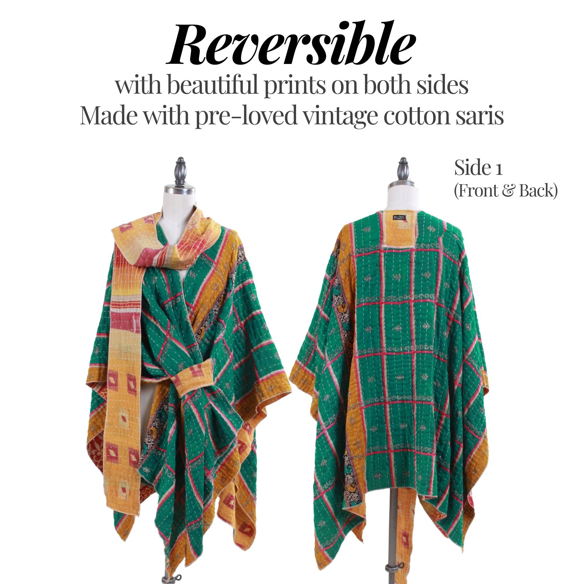 We created this cover-up using an authentic lightweight kantha quilt made from pre-loved vintage 100% cotton sarees, and re-imagined it into a wearable, multi-functional piece. Each one is unique.  More about our Kantha fabric
