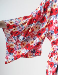 Bold floral print Kimono that infuses traditional sleeves with modern style. Unique cropped front, hi-lo design that you can wear it as an open front cardigan or criss cross button closure at the waistline.