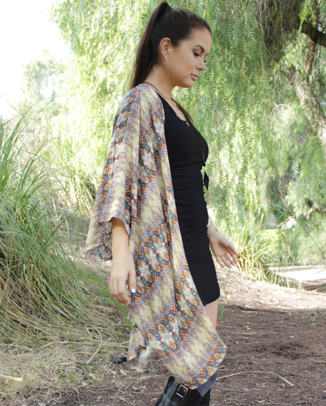 Oversized boho kimono coverup with exotic floral motif.  Comfortable with an easy going yet stylish look. It goes great with shorts, leggings, jeans, mini-dress, or as a coverup over bathing suits.