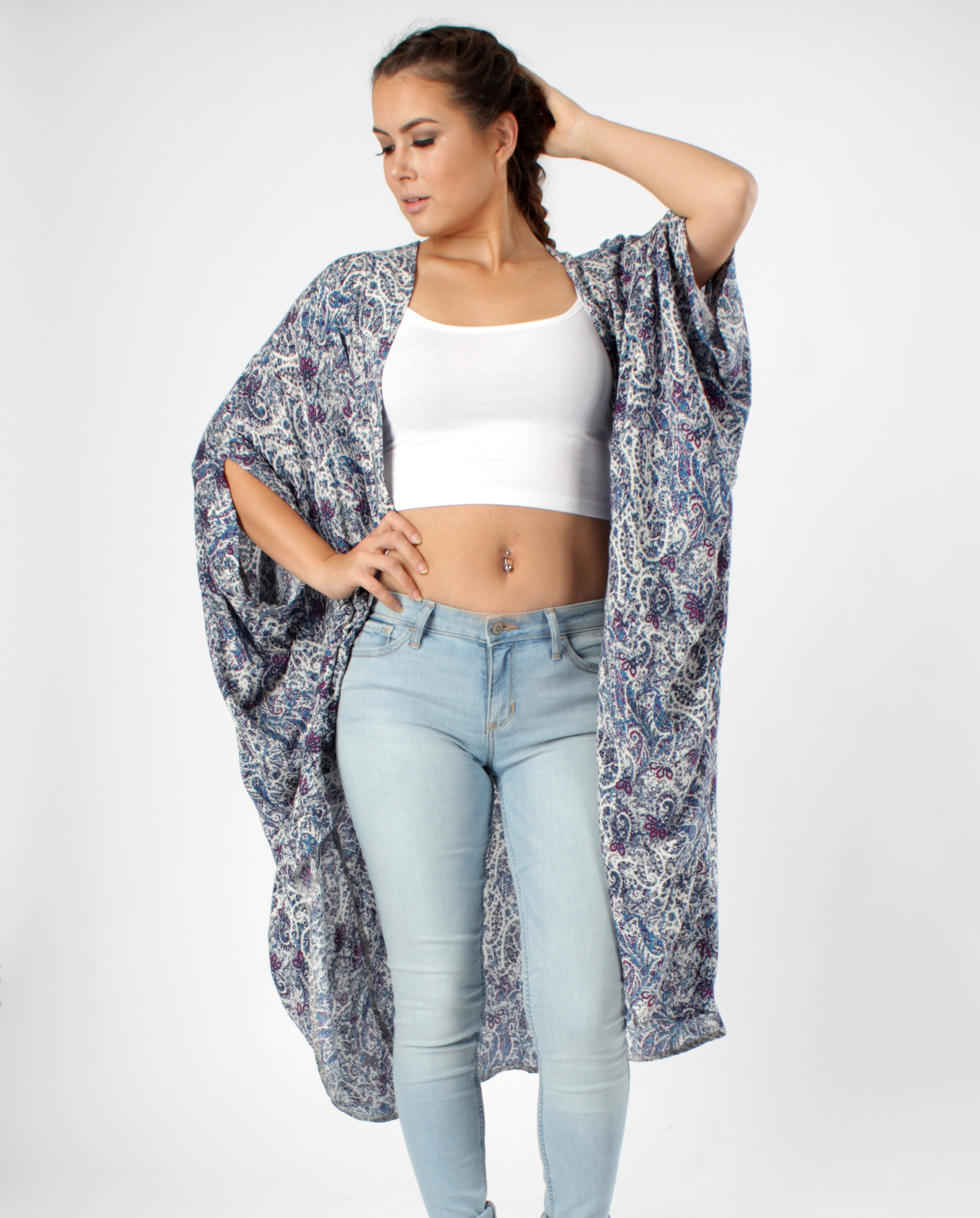 You can easily style this kimono with your existing wardrobe, from casual to chic. The beautiful paisley print add a delicate feminine touch, yet bold enough to be that special statement piece.