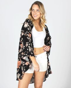 Floral print Kimono that infuses old traditional design with modern style, bringing you a bohemian look that is truly unique. It goes great with shorts and tank top, leggings with sports bra, jeans and t-shirt, mini-dress, or as a coverup over your bathing suit.