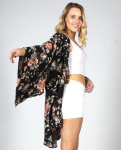Floral print Kimono that infuses old traditional design with modern style, bringing you a bohemian look that is truly unique. It goes great with shorts and tank top, leggings with sports bra, jeans and t-shirt, mini-dress, or as a coverup over your bathing suit.