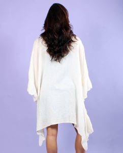 Oversized white boho kimono cover-up.  Comfortable with an easy going yet stylish look. It goes great with shorts and tank top, leggings and sports bra, jeans and t-shirt, mini-dress, or as a cover-up over bathing suit or lingerie.