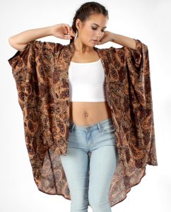You can easily style this kimono with your existing wardrobe, from casual to chic. The brown paisley print gives this piece a 70s retro hippie vibe.