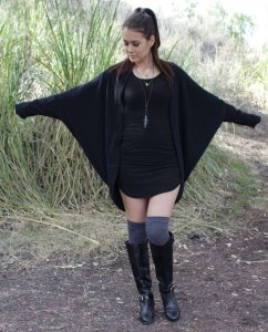 [vc_row][vc_column][vc_tta_tabs][vc_tta_section title=”Details” tab_id=”1456096124839-91fc6988-75a1″][vc_column_text]Wrap yourself in this cotton jersey cocoon cardigan (with floral scroll embroidery on back) for that added warmth and style. It is comfy, easily styled with jeans, leggings, shorts, or over lounge or workout wear. Perfect for Fall/Winter. Slouchy fit with batwing sleeves that drapes to a cocoon silhouette. Inspired by the Bohemian lifestyle and effortless fashion.