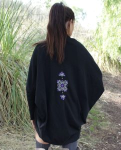 [vc_row][vc_column][vc_tta_tabs][vc_tta_section title=”Details” tab_id=”1456096124839-91fc6988-75a1″][vc_column_text]Wrap yourself in this cotton jersey cocoon cardigan (with floral scroll embroidery on back) for that added warmth and style. It is comfy, easily styled with jeans, leggings, shorts, or over lounge or workout wear. Perfect for Fall/Winter. Slouchy fit with batwing sleeves that drapes to a cocoon silhouette. Inspired by the Bohemian lifestyle and effortless fashion.