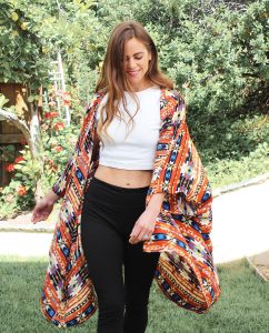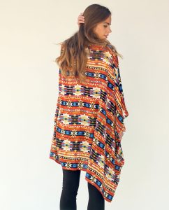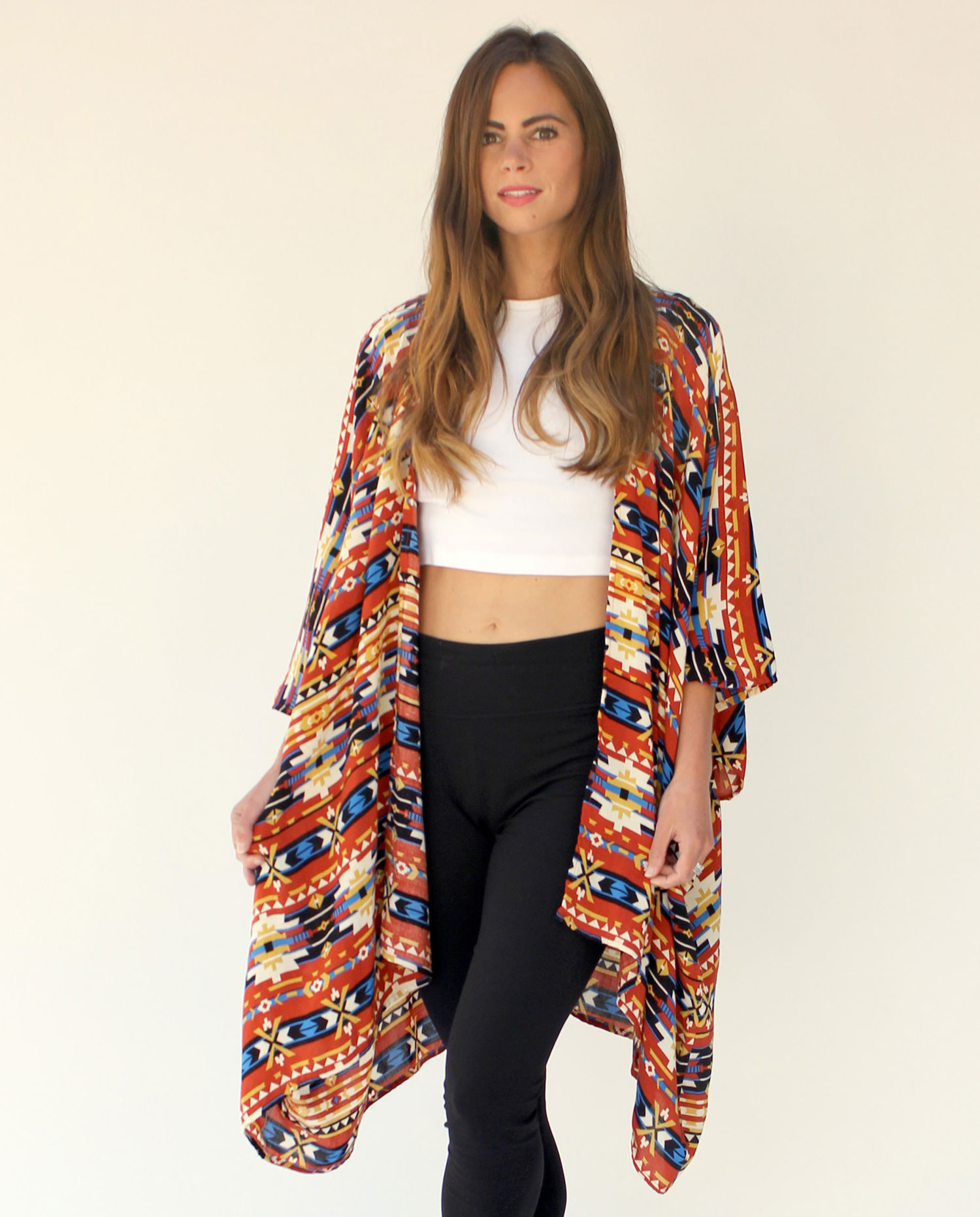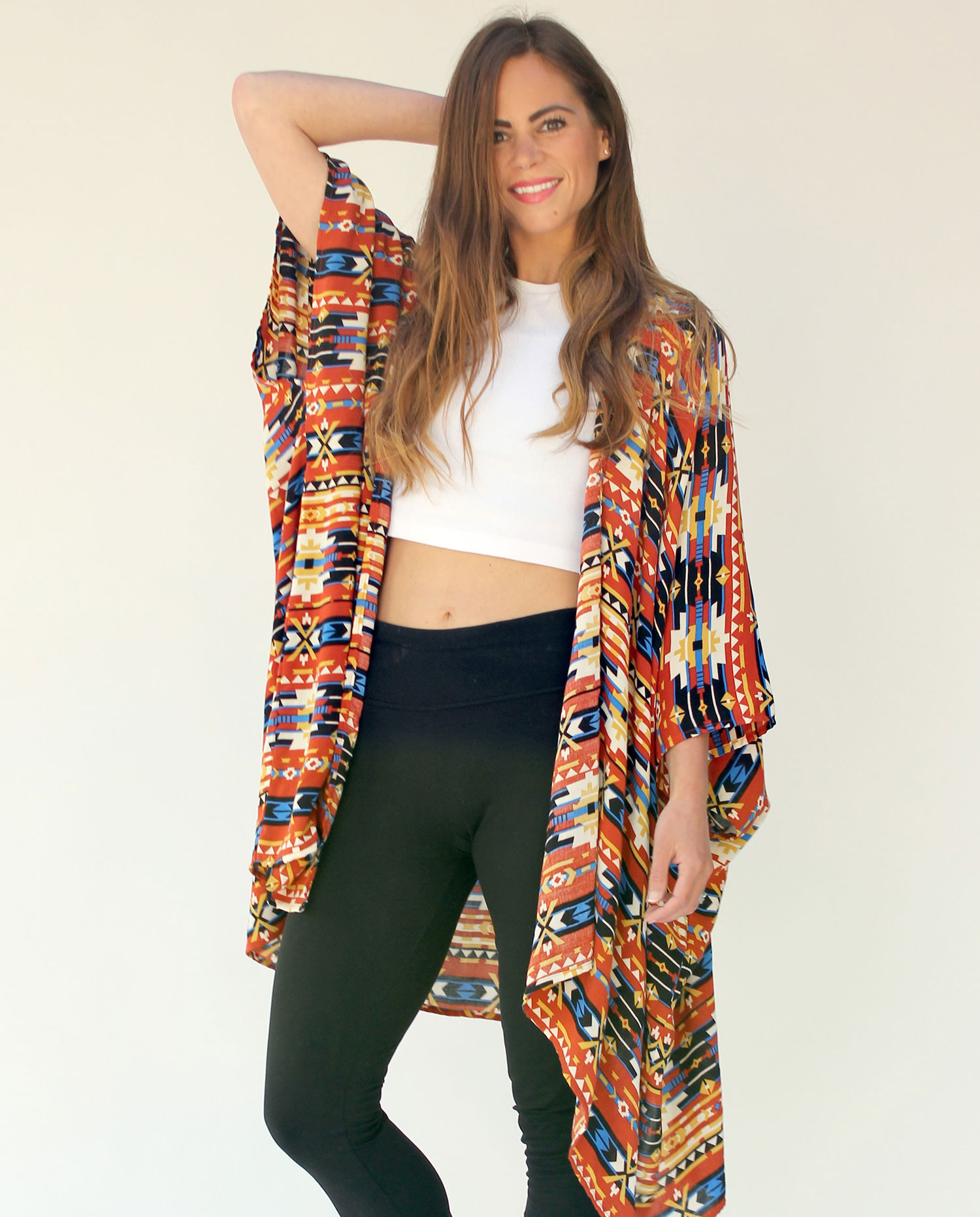 Oversized kimono cover up with colorful Native American inspired prints. Throw this on over a pair of shorts and tank top, jeans and t-shirt, summer dress, leggings and sports bra, or your favorite lingerie. It is so easy to style.