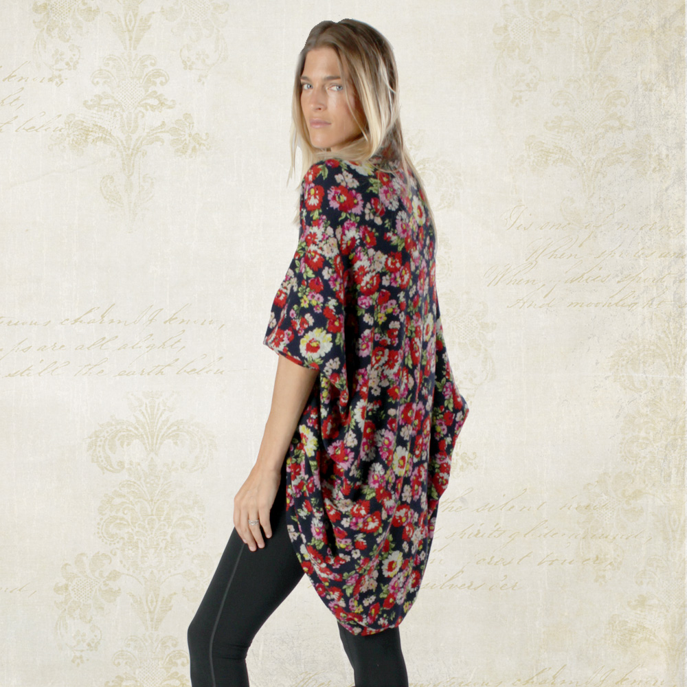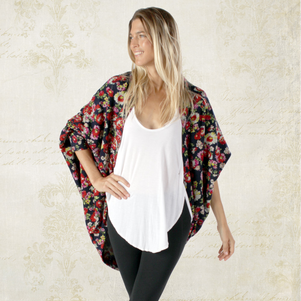Wrap yourself in this slouchy fit cardigan with batwing sleeves that drapes to a cocoon silhouette. The floral print is whimsical and the colors pop against the dark background.