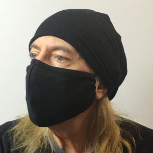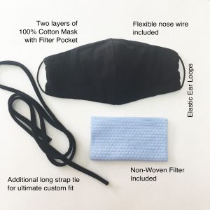 100% Cotton, solid color face mask.  Washable and reusable.  Comes with filter, nose wire, ear loops, and long strap for ultimate fit.