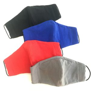 100% Cotton, solid color face mask.  Washable and reusable.  Comes with filter, nose wire, ear loops, and long strap for ultimate fit.