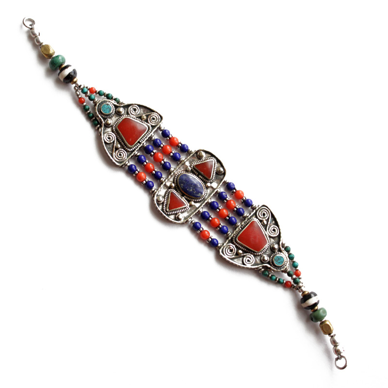 One of a kind colorful Tibetan bracelet with turquoise, lapis and coral gemstones. A beautiful statement piece with vintage feel. Could be worn as an anklet for a bold bohemian look.