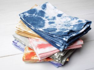Each napkin is hand tied and dyed on high quality 100% cotton with hemmed edges. These napkins have been triple washed and colorfast, perfect for everyday use.