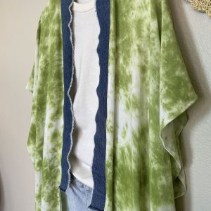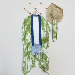 Happiest shade of green with frayed denim collar lapel details. Hand tied and dyed midi Duster. Each piece is unique.